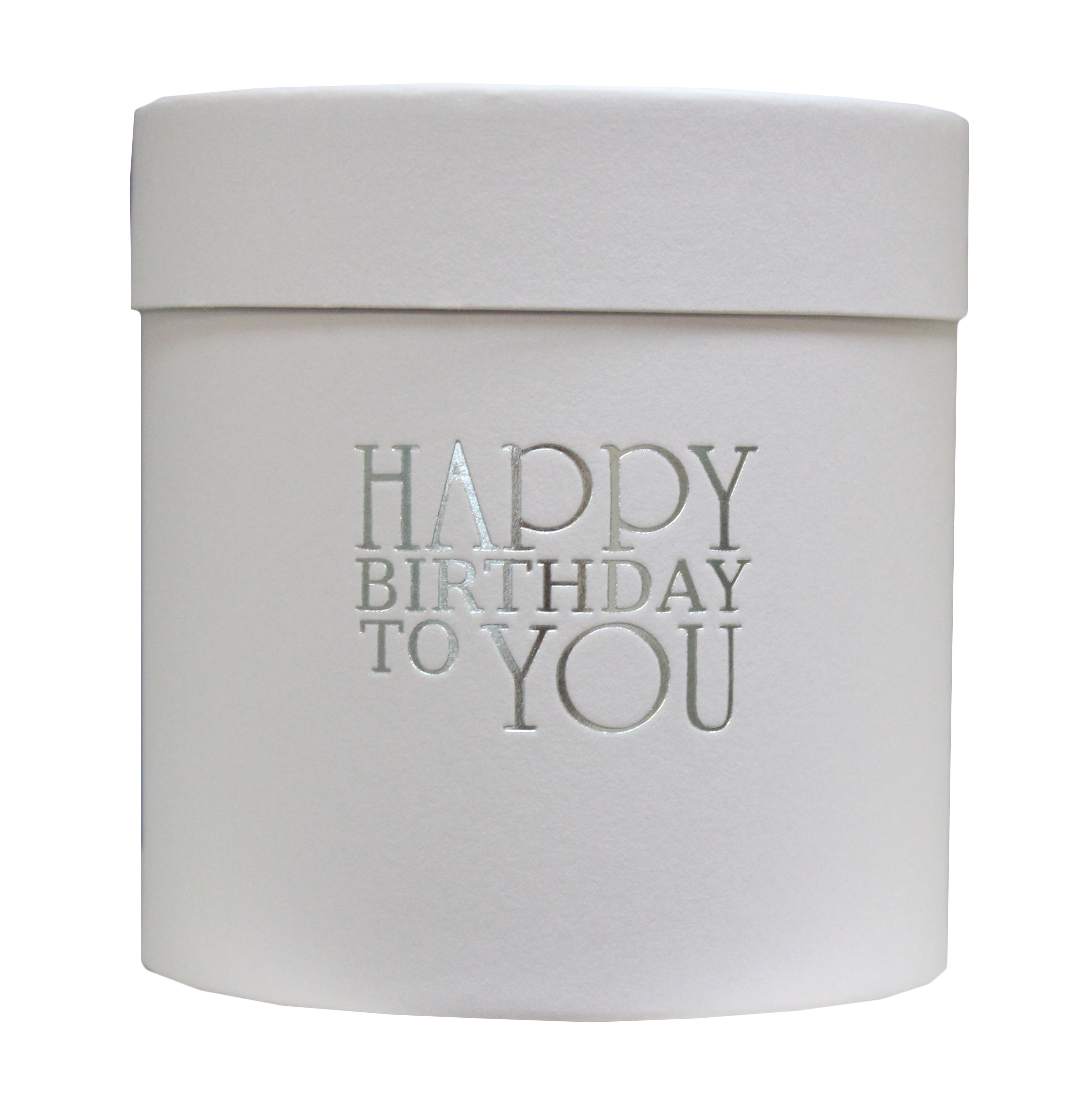 Коробка круглая (шляпная) с тиснением "Happy birthday" золото/серебро 140*140 мм, белый