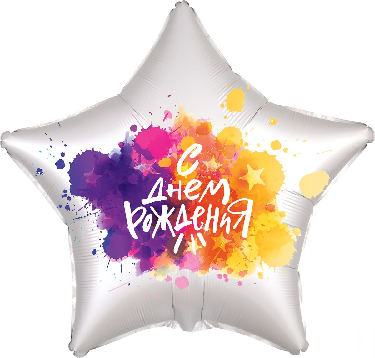 Шар (21''/53 см) Звезда, С Днем Рождения (краски), Белый жемчужный, Сатин