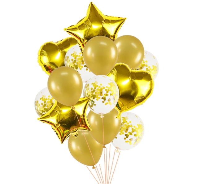 Связка шаров (4 фольгированных, 5 латексных хром и 5 с конфетти) Золото